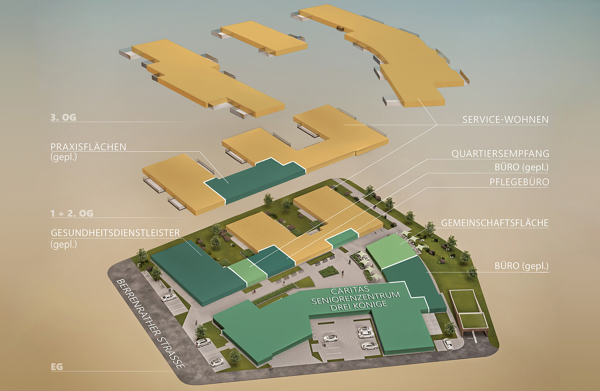 Der zweite Bauabschnitt mit seinen 79 Servicewohnungen und dem Seniorenzentrum richtet sich dagegen explizit an die zweite Lebenshälfte und ihre Wohnbedürfnisse. So bieten die Mietwohnungen im Service Wohnen neben einer barrierefreien und teils rollstuhlgerechten, komfortablen Wohnumgebung auch eine Vielzahl an Dienstleistungen, die den Alltag leichter machen und lange ein selbstbestimmtes Leben in den eigenen vier Wänden ermöglichen. Ein Quartiersempfang steht Ihnen dabei als „Kümmerer“ und Ansprechpartner für Ihre Anliegen zur Verfügung. Im Fall der Fälle ist das Seniorenzentrum der Caritas als Anlaufstelle für Menschen mit erhöhtem Pflegebedarf gleich nebenan. Um Gemeinschaft und ein harmonisches Miteinander von Jung und Alt zu fördern, finden sich im Quartier am Grüngürtel auch schöne Begegnungsflächen wie der Generationenspielplatz. Zudem stehen den Bewohnerinnen und Bewohnern Gemeinschaftsräume zur Verfügung, die vielfältige Möglichkeiten für gemeinsame Aktivitäten eröffnen.