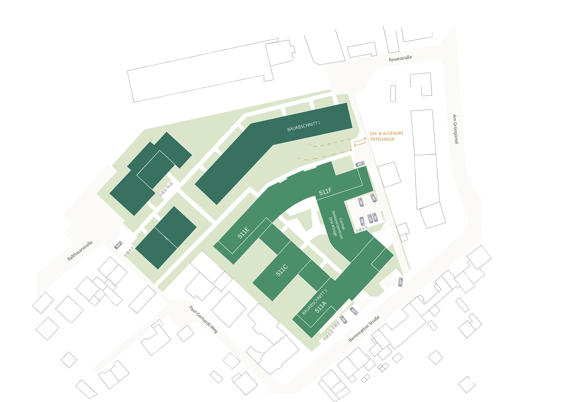 Im ersten Bauabschnitt (dunkelgrün hervorgehoben) sind 126 barrierefreie Eigentumswohnungen entstanden. Hier befindet sich zudem ein Generationenspielplatz mit Spiel- und Sportgeräten für Jung und Alt.